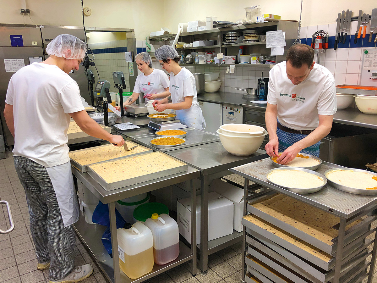 Hilfsmittel wie künstliche Aromen oder Enzyme sind im Biobetrieb tabu. Deshalb muss auf natürliche Schwankungen in der Zusammensetzung von Zutaten flexibel reagiert und improvisiert werden. Besonders interessant ist das Backen auch bei veganen Produkten wie dem Johannisbeer-Möhre-Nuss-Kuchen: keine Butter, kein Ei – dafür eine kunstvolle Collage aus Dinkelvollkornmehl, Sojamilch, Haselnüssen, Mandeln, Rohrzucker und vielen anderen Beteiligten. Äußerst komplex und seit über sieben Jahren ein absoluter Renner.