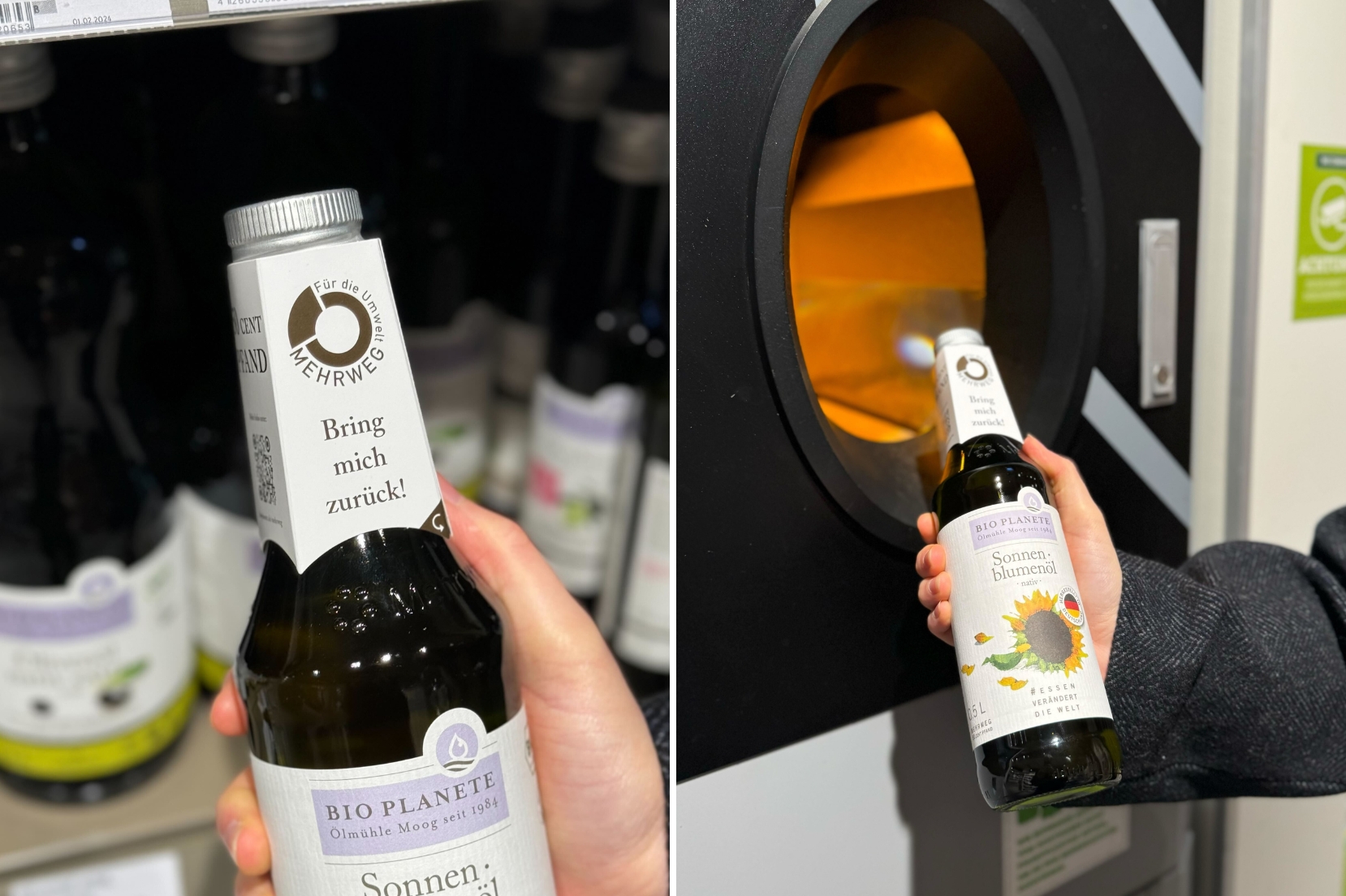 Über 2,5 Jahre Arbeit haben Bio Planète und Dotch in die Entwicklung ihres neuen Mehrwegsystems gesteckt. Das Resultat: Eine standardisierte, bruchsichere Glasflasche, die im Gegensatz zu herkömmlichen Ölflaschen bis zu 50 Mal wiederverwendet werden und so potenziell 290 Tonnen CO2 pro Jahr einsparen kann.