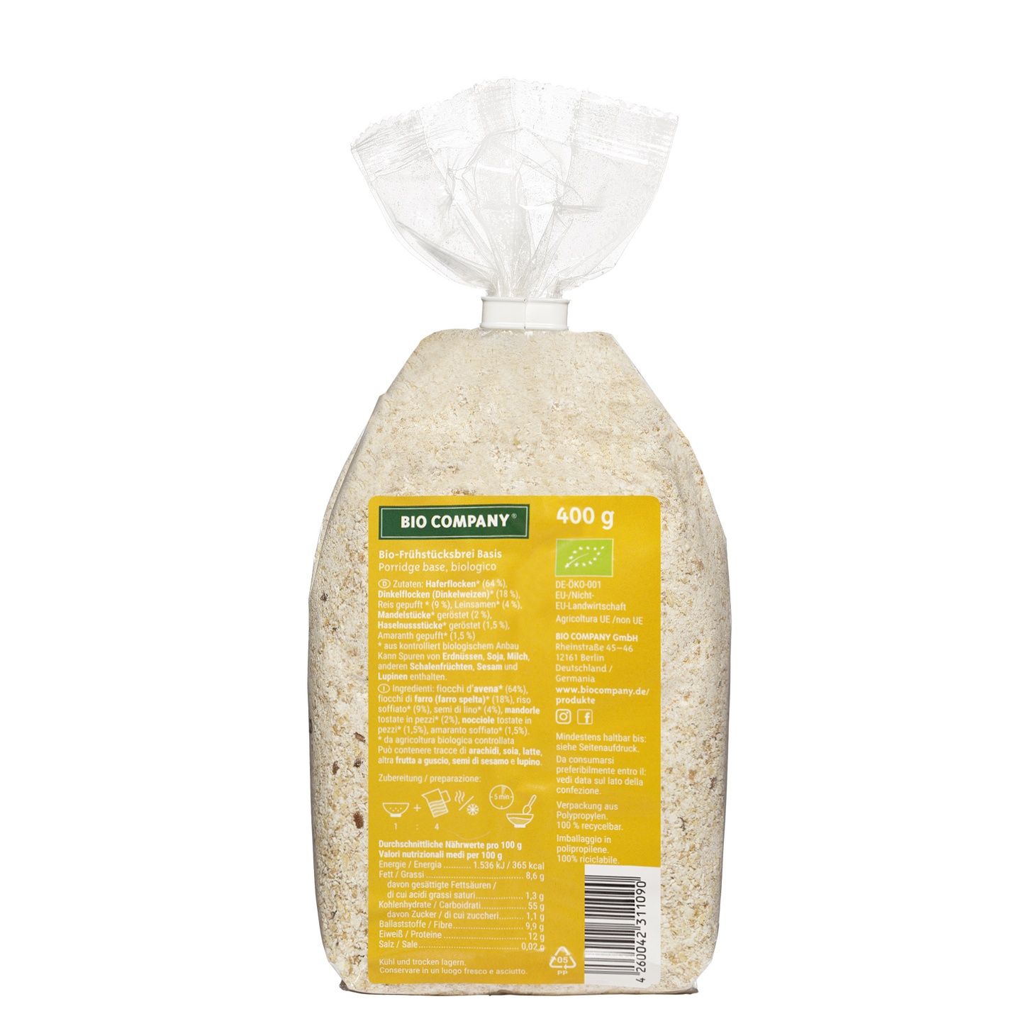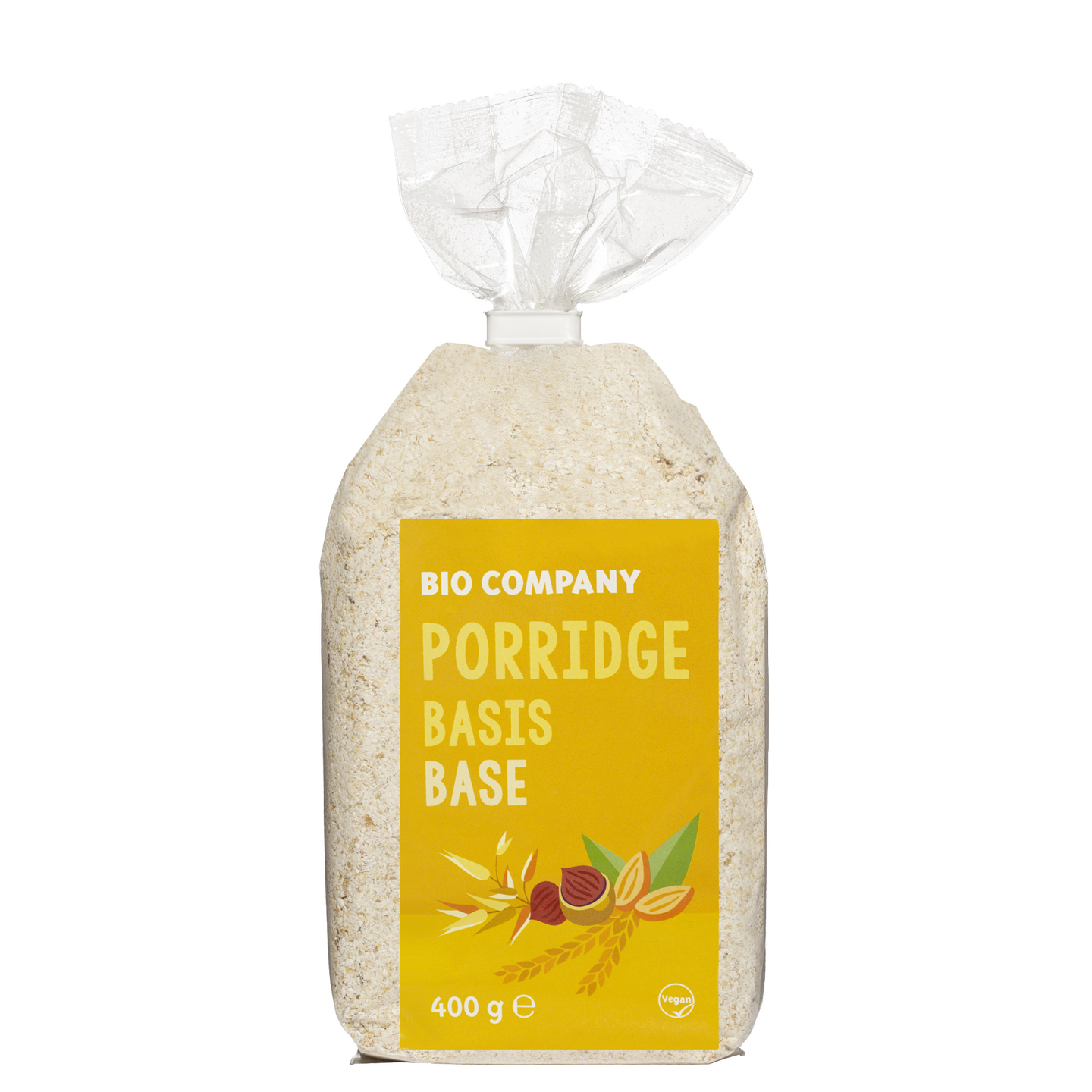 Basis Frühstücksbrei auf Grundlage von gemahlenen Hafer-, und Dinkelflocken. Mit Mandeln, Haselnüssen und Leinsamen verfeinert.
