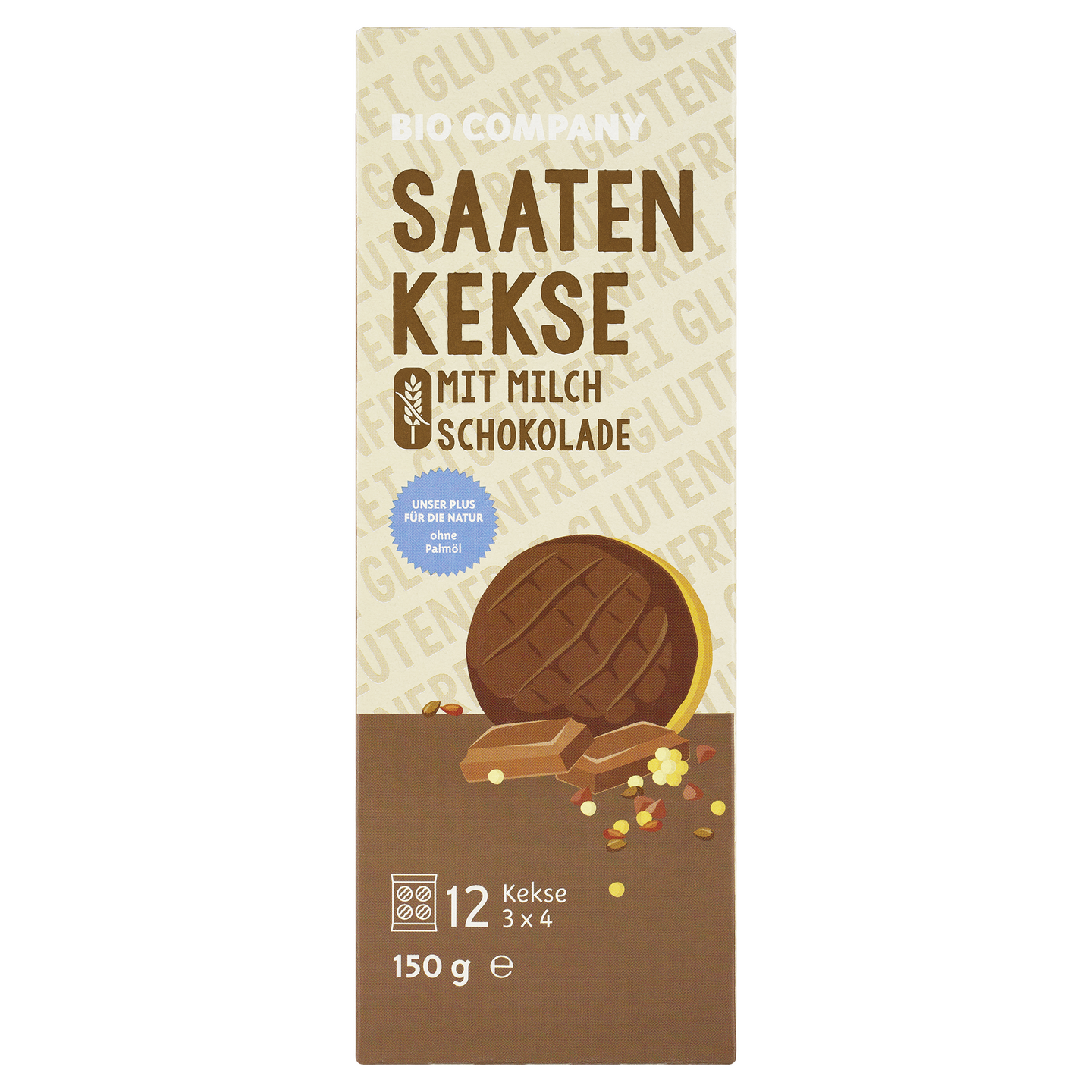 Mit Milchschokolade überzogene, glutenfreie Kekse, verfeinert mit gerösteten Saaten und für Menschen mit Glutenunverträglichkeit sorgfältig verpackt.